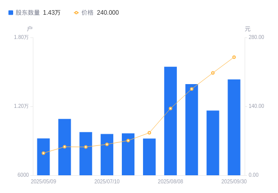 10月29日消息,数据显示,截至2025年9月30日,思泉新材A股股东总户数为1.43万户,较上期(2025年8月29日)增加2715户,增幅23.34%。公司最新A股总股本为8075.39万股,其中流通A股4760.07万股,户均持有流通A股数量为3317.81股,较上期减少774.4股,降幅18.92%;户均持流通A股市值79.63万元,较上期减少5.49万元,降幅6.45%。