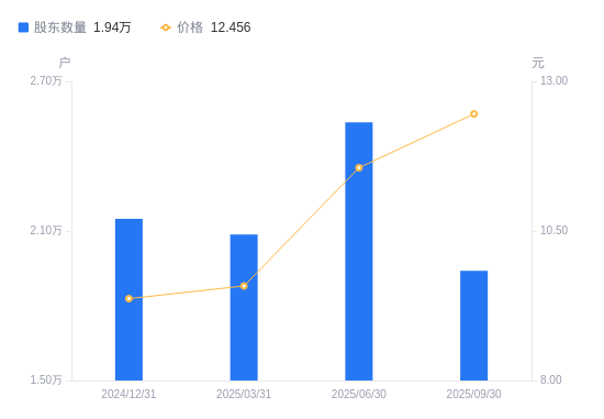 10月29日消息,数据显示,截至2025年9月30日,宝光股份A股股东总户数为1.94万户,较上期(2025年6月30日)减少5954户,降幅23.49%。公司最新A股总股本为3.3亿股,其中流通A股3.3亿股,户均持有流通A股数量为1.7万股,较上期增加3997.78股,增幅30.69%;户均持流通A股市值21.2万元,较上期增加6.15万元,增幅40.87%。