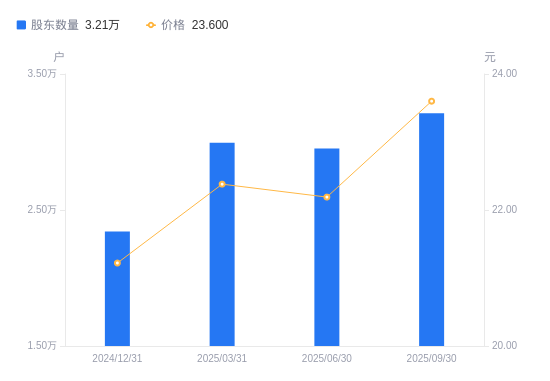 10月29日消息,数据显示,截至2025年9月30日,泰嘉股份A股股东总户数为3.21万户,较上期(2025年6月30日)增加2577户,增幅8.73%。公司最新A股总股本为2.52亿股,其中流通A股2.51亿股,户均持有流通A股数量为7811.64股,较上期减少681.75股,降幅8.03%;户均持流通A股市值18.44万元,较上期减少4113.53元,降幅2.18%。