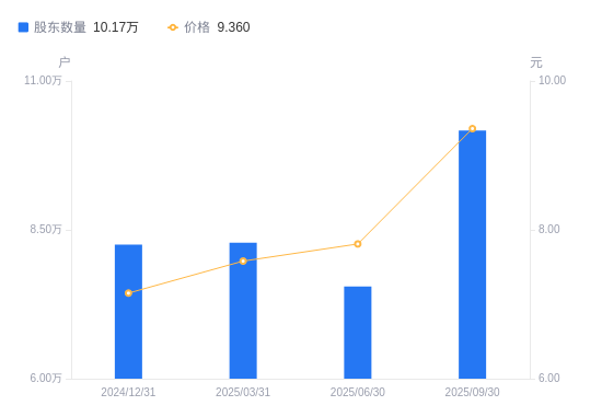 近一年(2024年9月30日至2025年9月30日),荣联科技A股股东户数从9.15万户,增加至10.17万户,增幅11.09%,区间股价上涨37.65%。