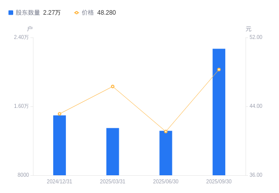 近一年(2024年9月30日至2025年9月30日),明阳电气A股股东户数从2.08万户,增加至2.27万户,增幅8.88%,区间股价上涨43.73%。