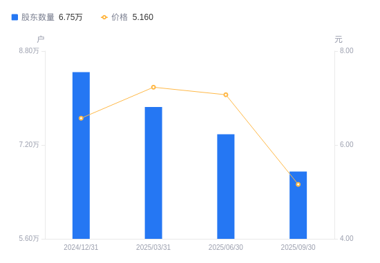 10月30日消息,数据显示,截至2025年9月30日,ST复华(维权)A股股东总户数为6.75万户,较上期(2025年6月30日)减少6360户,降幅8.62%。公司最新A股总股本为6.79亿股,其中流通A股6.79亿股,户均持有流通A股数量为1.01万股,较上期增加867.52股,增幅9.43%;户均持流通A股市值5.2万元,较上期减少1.31万元,降幅20.14%。