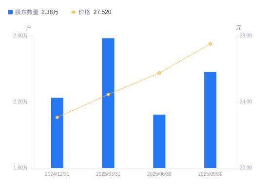 10月30日消息,数据显示,截至2025年9月30日,长江通信A股股东总户数为2.38万户,较上期(2025年6月30日)增加2600户,增幅12.25%。公司最新A股总股本为3.3亿股,其中流通A股2.12亿股,户均持有流通A股数量为8879.72股,较上期减少1087.74股,降幅10.91%;户均持流通A股市值24.44万元,较上期减少1.23万元,降幅4.81%。