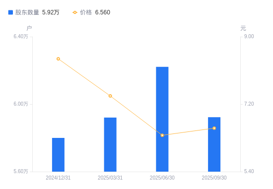 10月30日消息,数据显示,截至2025年9月30日,兰花科创A股股东总户数为5.92万户,较上期(2025年6月30日)减少2984户,降幅4.80%。公司最新A股总股本为14.73亿股,其中流通A股14.73亿股,户均持有流通A股数量为2.49万股,较上期增加1193.01股,增幅5.04%;户均持流通A股市值16.32万元,较上期增加1.23万元,增幅8.17%。