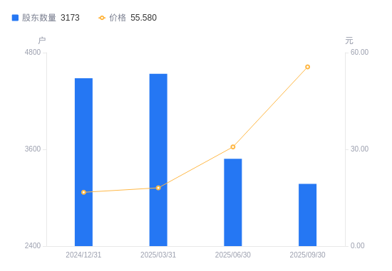 近一年(2024年9月30日至2025年9月30日),纬德信息A股股东户数从4958户,减低至3173户,降幅36.00%,区间股价上涨298.45%。