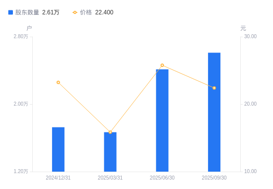 10月30日消息,数据显示,截至2025年9月30日,宜宾纸业A股股东总户数为2.61万户,较上期(2025年6月30日)增加1971户,增幅8.17%。公司最新A股总股本为1.77亿股,其中流通A股1.77亿股,户均持有流通A股数量为6777.93股,较上期减少553.66股,降幅7.55%;户均持流通A股市值15.18万元,较上期减少3.71万元,降幅19.64%。
