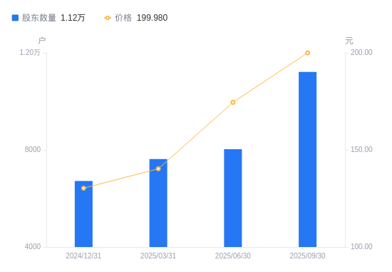 近一年(2024年9月30日至2025年9月30日),纳芯微A股股东户数从6284户,增加至1.12万户,增幅78.47%,区间股价上涨102.00%。
