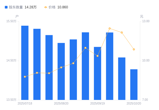 近一年(2024年10月10日至2025年10月10日),中国宝安A股股东户数从16.8万户,减低至14.58万户,降幅13.22%,区间股价上涨26.69%。