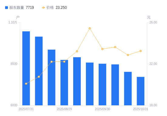 近一年(2024年12月31日至2025年10月31日),开润股份A股股东户数从1.07万户,减低至7719户,降幅27.65%,区间股价下跌2.04%。