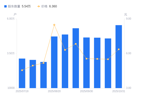 近一年(2024年10月31日至2025年10月31日),电子城A股股东户数从4.17万户,增加至5.54万户,增幅33.10%,区间股价上涨16.27%。