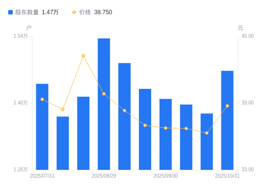 近一年(2024年10月31日至2025年10月31日),金凯生科A股股东户数从1.15万户,增加至1.47万户,增幅27.75%,区间股价上涨27.17%。
