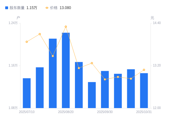 近一年(2024年10月31日至2025年10月31日),洪汇新材A股股东户数从1.2万户,减低至1.15万户,降幅4.85%,区间股价上涨15.29%。