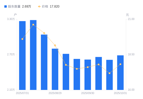 近一年(2024年10月31日至2025年10月31日),中船汉光A股股东户数从2.75万户,减低至2.69万户,降幅2.39%,区间股价下跌3.80%。