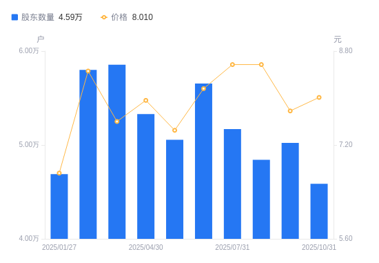 近一年(2024年10月31日至2025年10月31日),华宇软件A股股东户数从6.9万户,减低至4.59万户,降幅33.56%,区间股价下跌12.27%。