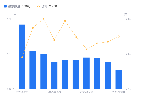 近一年(2024年12月31日至2025年10月31日),佳隆股份A股股东户数从5.29万户,减低至3.96万户,降幅25.21%,区间股价上涨4.17%。