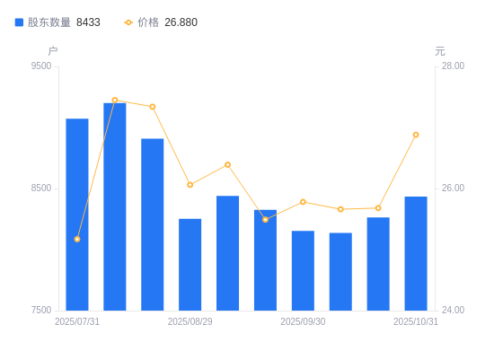 近一年(2024年12月20日至2025年10月31日),研奥股份A股股东户数从9971户,减低至8433户,降幅15.42%,区间股价上涨27.98%。