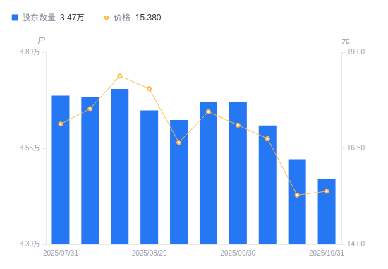 近一年(2024年10月31日至2025年10月31日),东软载波A股股东户数从2.96万户,增加至3.47万户,增幅17.32%,区间股价下跌9.53%。