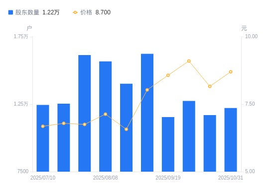 近一年(2024年11月20日至2025年10月31日),延江股份A股股东户数从1.35万户,减低至1.22万户,降幅9.65%,区间股价上涨58.44%。