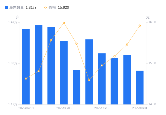 近一年(2024年10月31日至2025年10月31日),万祥科技A股股东户数从1.39万户,减低至1.31万户,降幅6.19%,区间股价下跌1.73%。