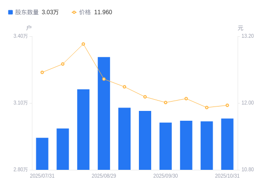 近一年(2024年10月31日至2025年10月31日),劲仔食品A股股东户数从1.77万户,增加至3.03万户,增幅70.78%,区间股价下跌0.46%。