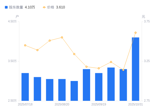 近一年(2024年10月31日至2025年10月31日),华塑控股A股股东户数从3.4万户,增加至4.1万户,增幅20.59%,区间股价上涨5.56%。