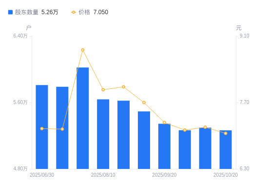 11月5日消息,数据显示,截至2025年10月20日,雅本化学A股股东总户数为5.26万户,较上期(2025年10月10日)减少316户,降幅0.60%。公司最新A股总股本为9.63亿股,其中流通A股9.43亿股,户均持有流通A股数量为1.79万股,较上期增加106.84股,增幅0.60%;户均持流通A股市值12.63万元,较上期减少1560.9元,降幅1.22%。