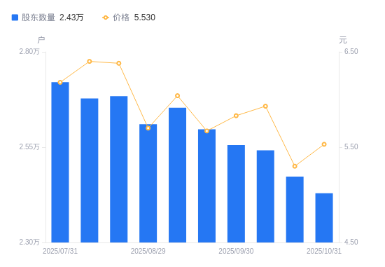 近一年(2024年11月8日至2025年10月31日),如意集团A股股东户数从2.47万户,减低至2.43万户,降幅1.60%,区间股价上涨7.59%。