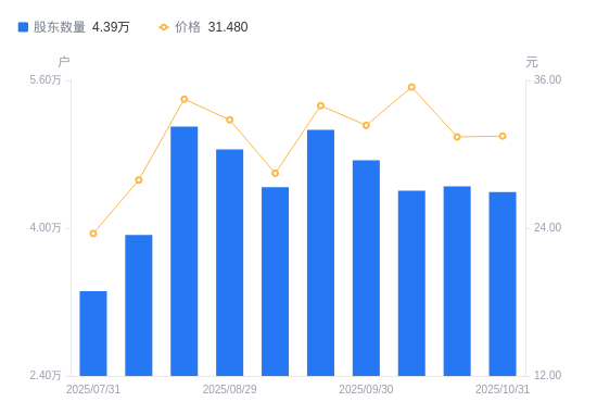 近一年(2024年10月31日至2025年10月31日),飞荣达A股股东户数从4.61万户,减低至4.39万户,降幅4.64%,区间股价上涨44.66%。