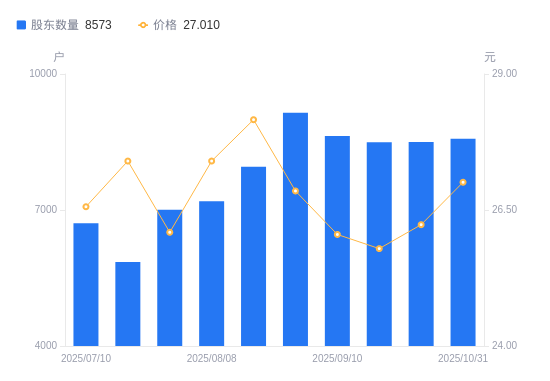 近一年(2024年10月31日至2025年10月31日),侨源股份A股股东户数从3492户,增加至8573户,增幅145.50%,区间股价下跌12.22%。