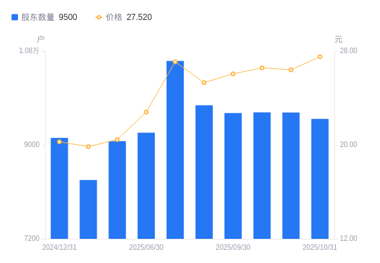 近一年(2024年12月31日至2025年10月31日),科净源A股股东户数从9135户,增加至9500户,增幅4.00%,区间股价上涨33.59%。