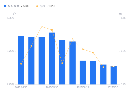 近一年(2024年12月10日至2025年10月31日),威龙股份A股股东户数从3.08万户,减低至2.53万户,降幅17.95%,区间股价下跌37.44%。