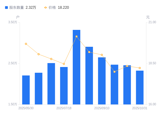 近一年(2024年12月20日至2025年10月31日),爱婴室A股股东户数从1.29万户,增加至2.32万户,增幅80.16%,区间股价下跌18.72%。
