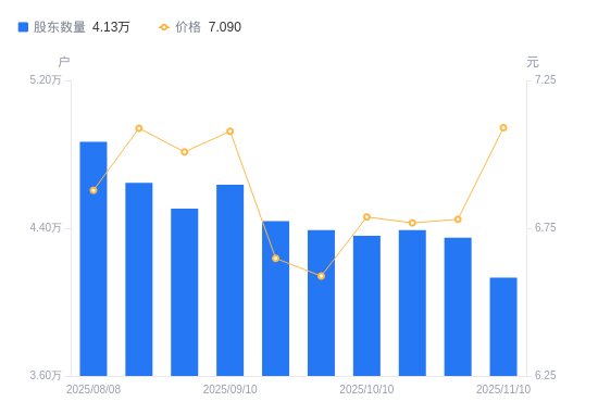 近一年(2024年11月20日至2025年11月10日),泰山石油A股股东户数从3.86万户,增加至4.13万户,增幅6.96%,区间股价上涨21.74%。