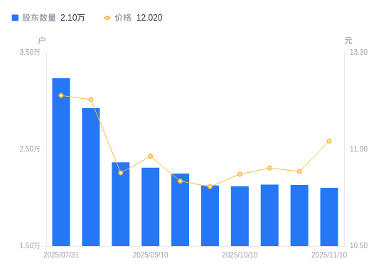 近一年(2024年11月20日至2025年11月10日),中设股份A股股东户数从1.5万户,增加至2.1万户,增幅39.83%,区间股价上涨11.30%。