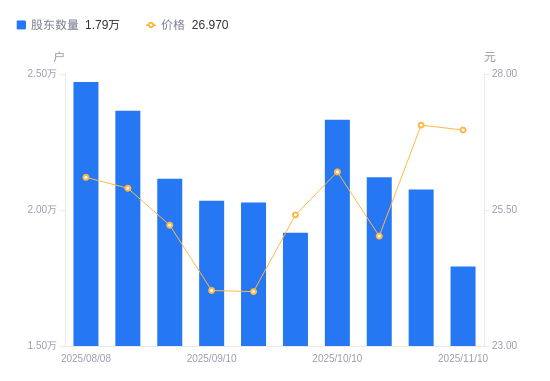 近一年(2024年11月20日至2025年11月10日),壶化股份A股股东户数从8812户,增加至1.79万户,增幅103.44%,区间股价上涨28.18%。