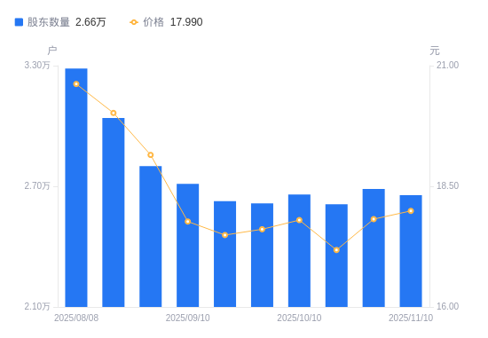 近一年(2024年11月20日至2025年11月10日),中船汉光A股股东户数从2.64万户,增加至2.66万户,增幅0.51%,区间股价下跌1.28%。