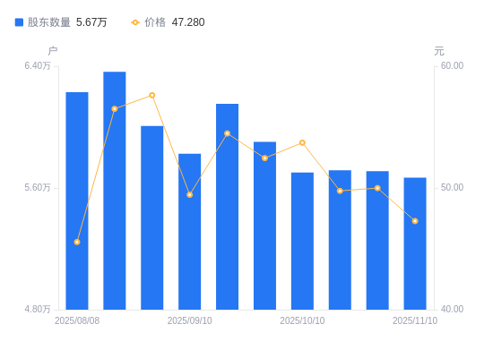 近一年(2024年11月20日至2025年11月10日),高新发展A股股东户数从8.36万户,减低至5.67万户,降幅32.20%,区间股价下跌17.41%。