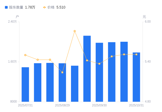 近一年(2024年10月31日至2025年10月31日),罗普斯金A股股东户数从1.56万户,增加至1.78万户,增幅14.20%,区间股价上涨0.73%。