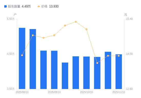 近一年(2024年11月20日至2025年11月10日),万安科技A股股东户数从5.62万户,减低至4.49万户,降幅20.13%,区间股价下跌4.39%。
