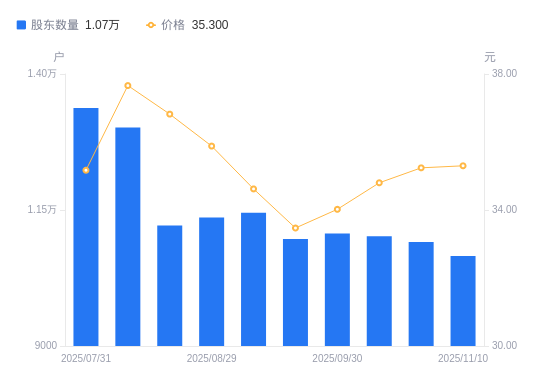 近一年(2024年11月20日至2025年11月10日),富士莱A股股东户数从1.11万户,减低至1.07万户,降幅3.81%,区间股价上涨30.98%。
