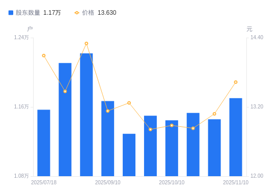 近一年(2024年11月20日至2025年11月10日),洪汇新材A股股东户数从1.12万户,增加至1.17万户,增幅4.73%,区间股价上涨15.49%。