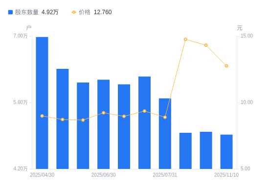 近一年(2024年11月20日至2025年11月10日),宁波东力A股股东户数从4.03万户,增加至4.92万户,增幅22.30%,区间股价上涨153.68%。