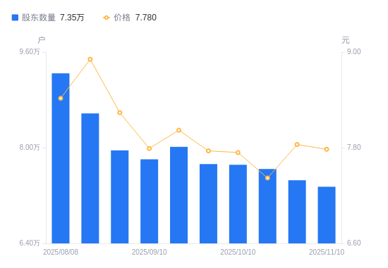 近一年(2024年11月20日至2025年11月10日),远东传动A股股东户数从7.75万户,减低至7.35万户,降幅5.19%,区间股价上涨21.75%。
