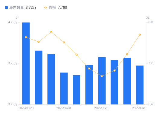 近一年(2024年11月20日至2025年11月10日),闰土股份A股股东户数从3.22万户,增加至3.72万户,增幅15.69%,区间股价上涨16.62%。