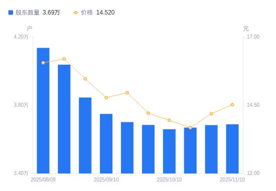 近一年(2024年11月20日至2025年11月10日),朗玛信息A股股东户数从3.96万户,减低至3.69万户,降幅6.97%,区间股价下跌2.32%。