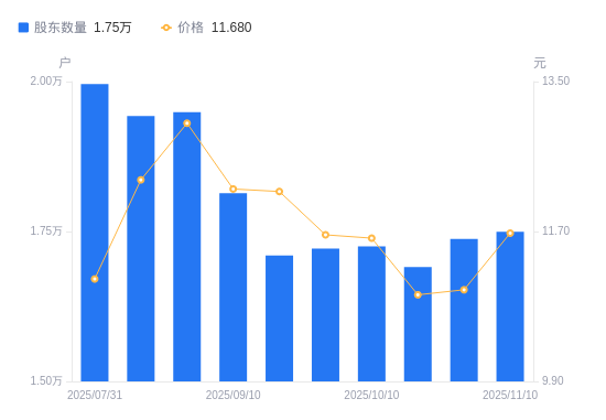 近一年(2024年11月20日至2025年11月10日),聚合顺A股股东户数从1.39万户,增加至1.75万户,增幅25.45%,区间股价上涨7.88%。