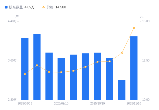 近一年(2024年11月20日至2025年11月10日),佳电股份A股股东户数从2.49万户,增加至4.09万户,增幅64.22%,区间股价上涨23.88%。