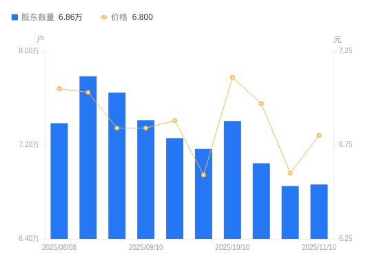 近一年(2024年11月20日至2025年11月10日),西部建设A股股东户数从7.42万户,减低至6.86万户,降幅7.53%,区间股价下跌3.89%。