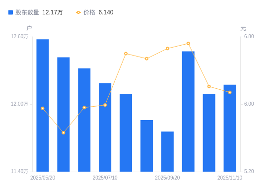 近一年(2024年11月30日至2025年10月31日),长信科技A股股东户数从13.55万户,减低至12.09万户,降幅10.80%,区间股价下跌8.56%。