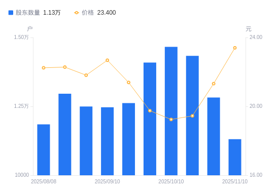 近一年(2024年11月20日至2025年11月10日),西麦食品A股股东户数从1.82万户,减低至1.13万户,降幅37.77%,区间股价上涨85.10%。